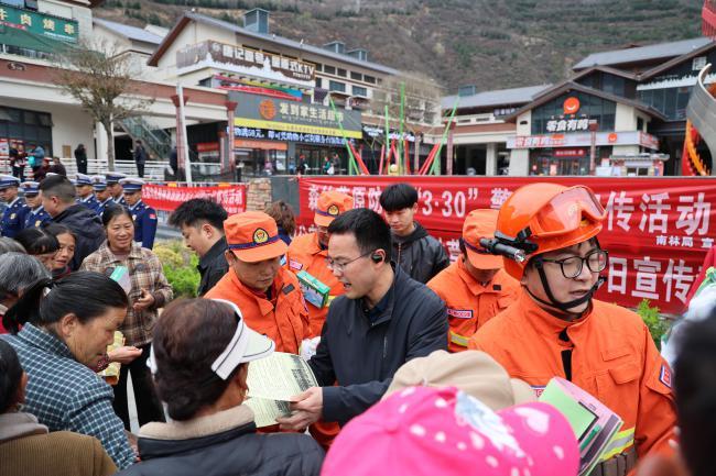 为筑牢春季森林草原防灭火坚固防线,切实提升群众防火安全意识,2026年3月30日,阿坝州南坪国有林保护局联合九寨沟县应急管理局、林草局、消防队、林业公安,在九寨沟县祥云里广场开展“3·30”森林防火警示日集中宣传活动;同步统筹各基层林场联动发力,组织半专业扑火队员统一着装开展宣传,通过车载广播、进村入户开展全域流动宣传,构建“集中宣讲+全域覆盖”的立体化宣传格局,实现防火宣传无死角。